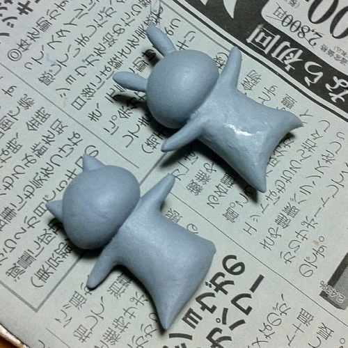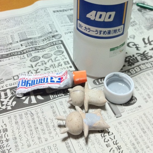 うさねこに溶きパテを塗りたくりました。私は溶きパテにはグンゼのMr.ラッカー薄め液とタミヤのラッカーパテを使っています。今では溶いて液体状になっているラッカーパテも売られていますが、自分でも作れるしまあいいかなと。この後完全乾燥したらサンドペーパーで磨きをかけていきます。