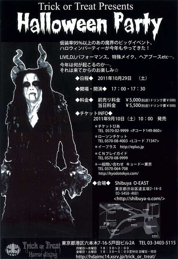 先に告知したTrick or Treat presents Halloween party 2011」の情報追加です。オフィシャルの方でも情報解禁となったのでこちらにも転載させて頂きます。