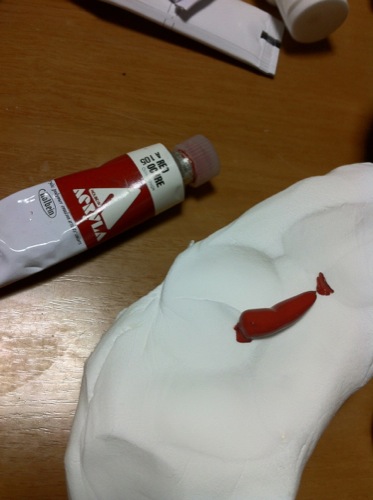 それにアクリル絵の具を直接混ぜて内部着色します。(素材に直接色を混ぜることを内部着色といいます)