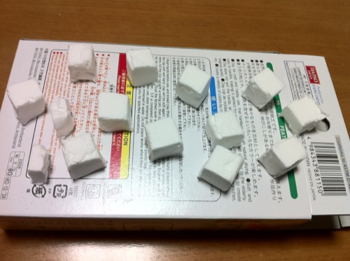 まあ作ると言っても紙粘土の塊からいい感じに木綿豆腐っぽく切るだけですが。紙粘土は水分が蒸発すると若干縮むのでそれも考えて気持ち大きめに切ります。あと木綿豆腐なので敢え荒くザックリ切ってます。