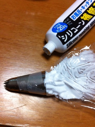 最初のカップと紙粘土の接着に使用したシリコンコーキング。これをクリームを絞る口金に入れて…