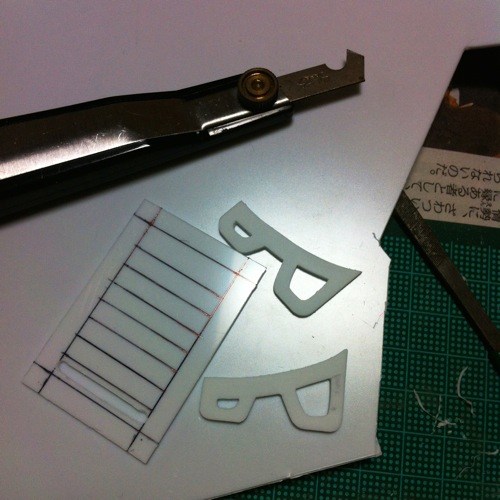 とりあえずビーチチェアを作ります。材料は1mm厚のプラバン。足の部分はそれぞれのパーツを2枚重ねにして2mm厚にします。パーツの外側を切り出して貼り合わせること自体は別にいいんですが、パーツの”中抜き”をするのがすげえめんどくさい!デザインナイフでぐりぐり穴をたくさん開けてニッパーで切り、棒ヤスリで地道に削って形を整えるという地道な作業をするしかありません。