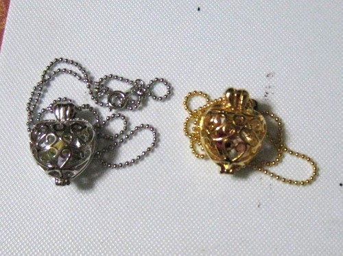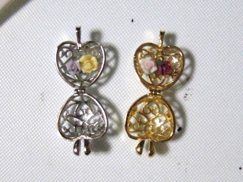 これは、パーツ屋でたまたま見つけたハート型の籠型チャームを使ってみたもの。中に樹脂粘土製のバラを入れてみた。