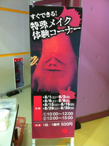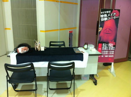 秋田ふるさと村」のお化け屋敷企画「怨霊病院」の一環として特殊メイクブースの出展が始まりました。