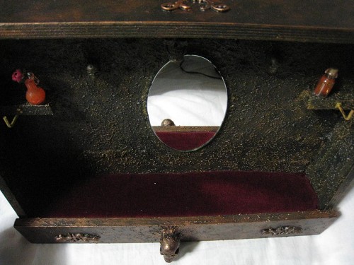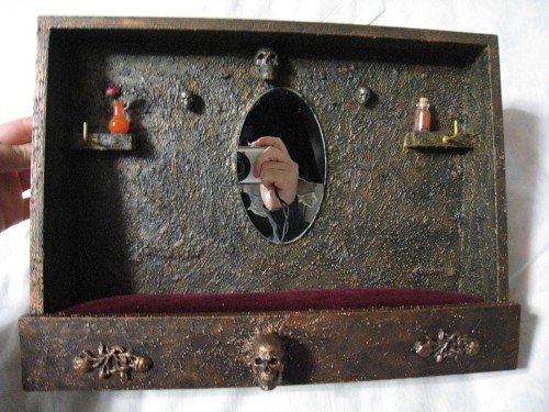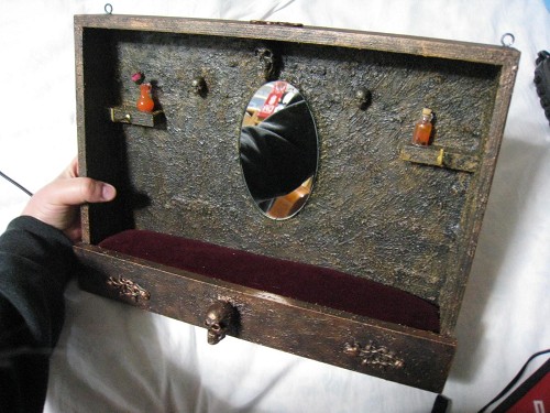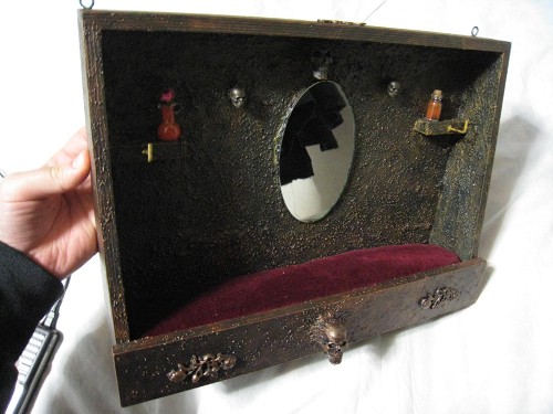 壁のフックや髑髏、瓶類にはネックレスやブレスレットが掛けられるようになっており、床部分はスポンジにベルベット布を貼って作っているのでピンを刺すことも可能。