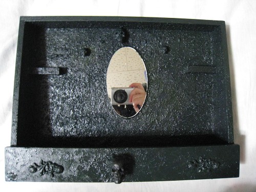 箱内部の下地塗りは完成。アクリル絵の具に砂を混ぜた上に敢えて細い筆で塗り重ねて筆跡のテクスチャを付けました。