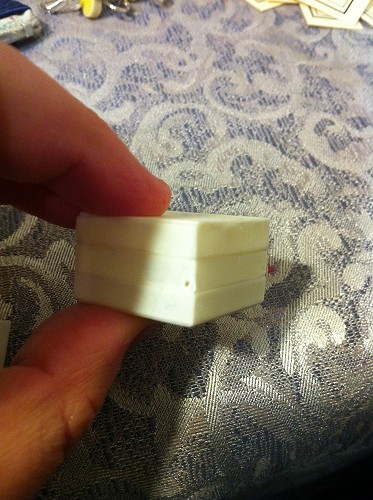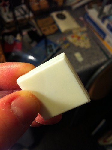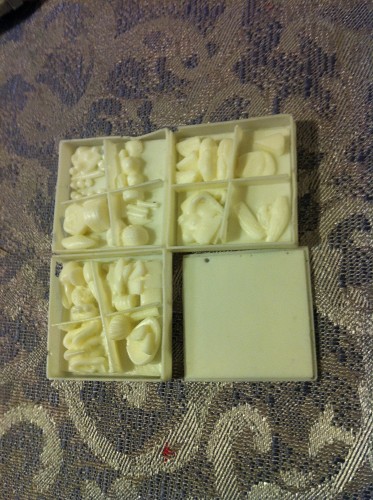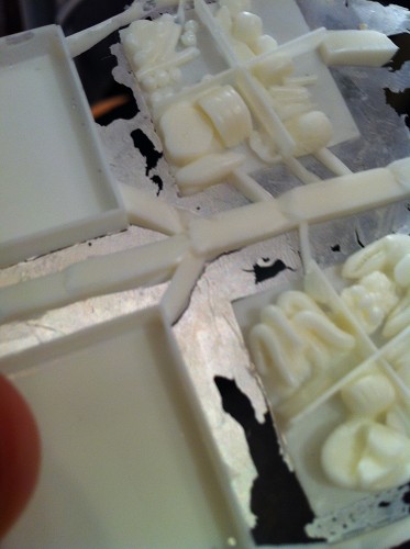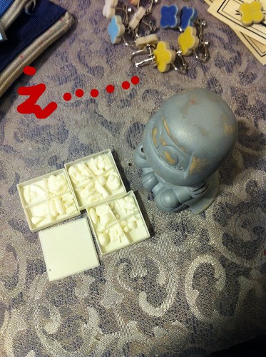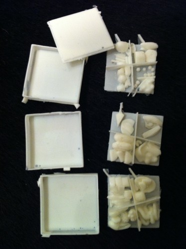 おそらくプラ版の箱組みで作られたであろう重箱と仕切り。仕切りの斜めっぷりもちゃんと再現されています。しかし薄い板の部分までキャストが流れ込んでいるのが凄い。気泡もありますが修正可能な範囲です。