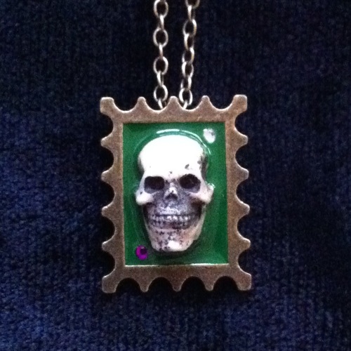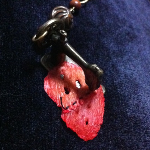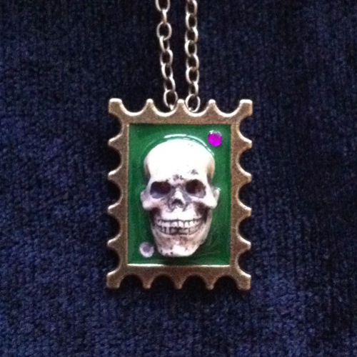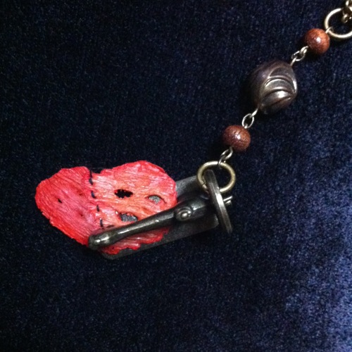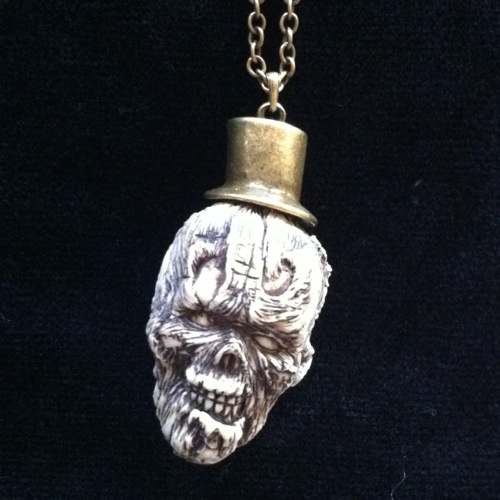 シンプルなゾンビペンダントです。頭にシルクハット型のチャームを接着してチェーンを通しています。ちょっとゾンビが大きかったかも…。これよりもう一回り小さいゾンビの頭があれば丁度良いかも。