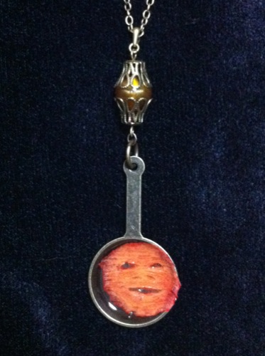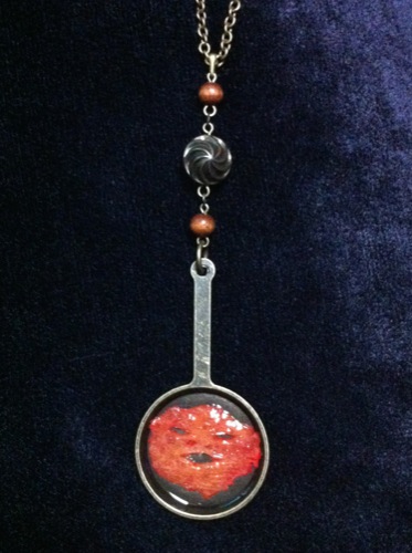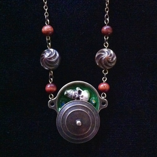 ミニskullが入った鍋のネックレス。この鍋に見覚えのある方は鋭い!実はこれ、以前100円ショップのSeriaで買ってきた鍋のオブジェです。その中にミニskullとビーズを入れて樹脂で固定しました。フタは落ちないようにエポキシパテとエポキシ接着剤でガッツリ接着しています。