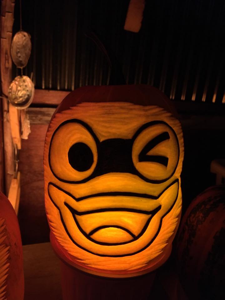 ひん曲がった形を反映して顔も曲がった感じにしてみました。凹みのところは口にして貫通。裏からワタと種をくり抜くと凹んだところだけ薄くなって強度が弱くなってしまうので、それなら穴にして貫通させた方が手っ取り早いってもんです。