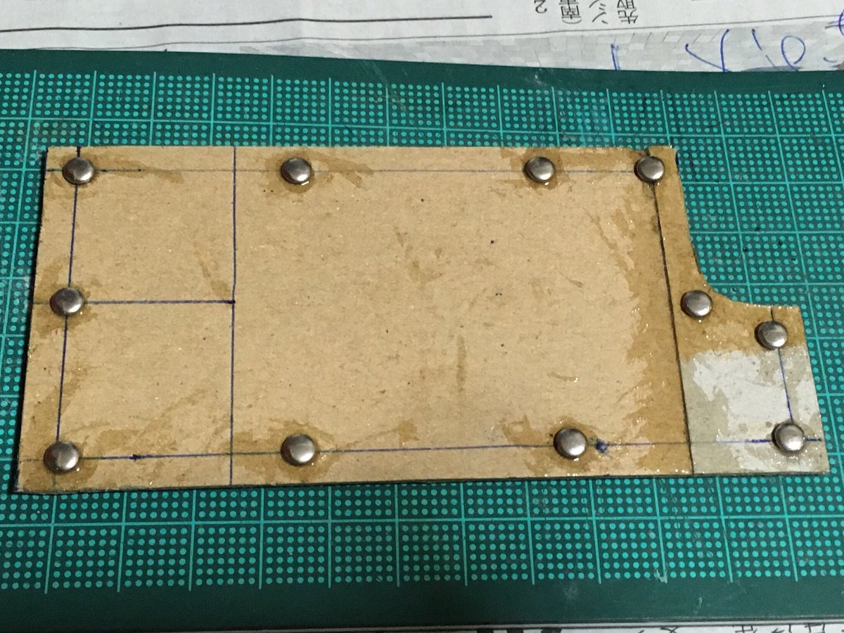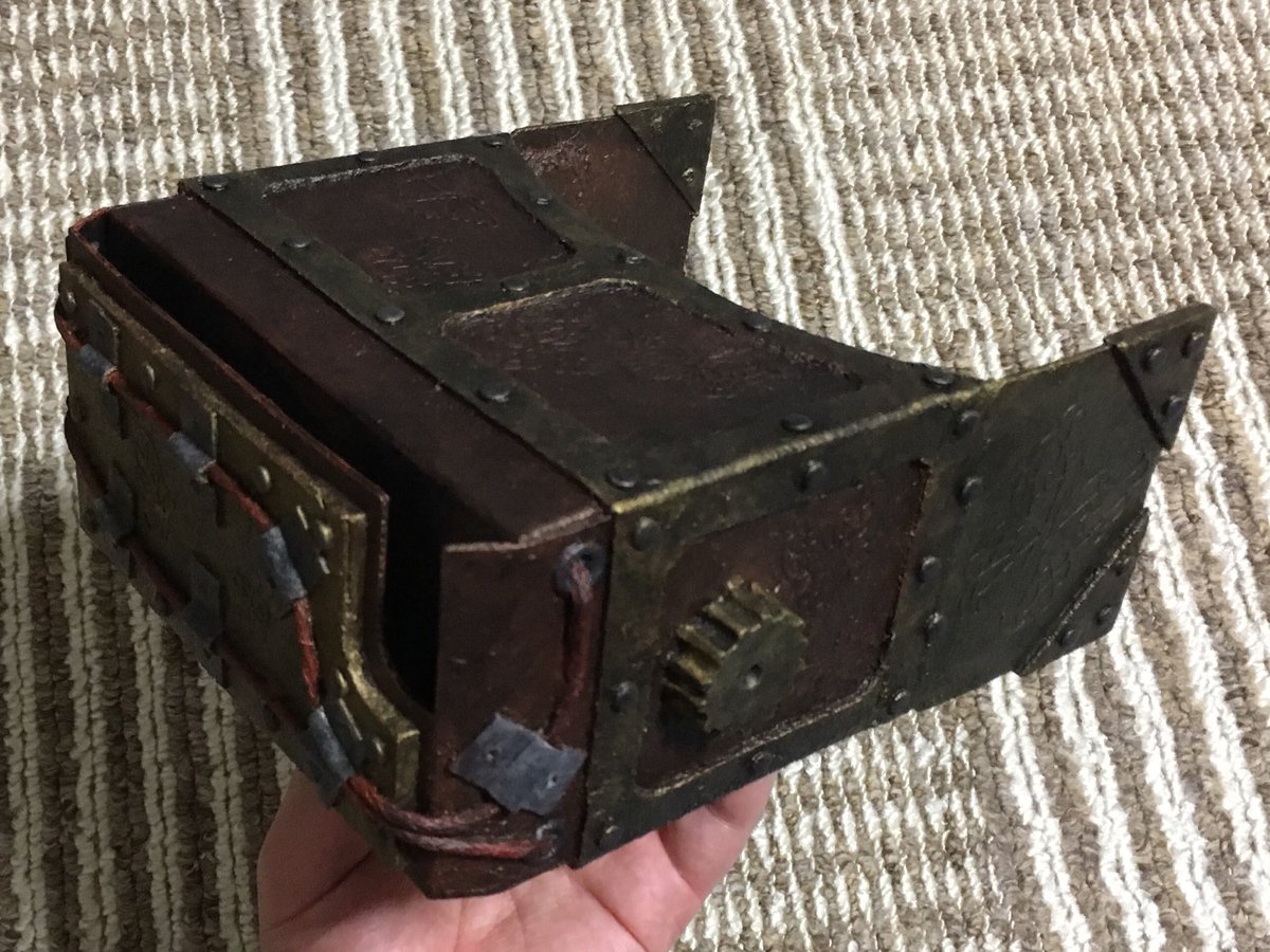 とりあえず余った色を適当に混ぜて全体に塗ってみました。塗装はダイソーで買ったアクリル絵の具です。アクリル絵の具はすぐ乾くので作業効率が上がります。ここまできたらそろそろ「スチームパンク」って言ってもいいでしょう。