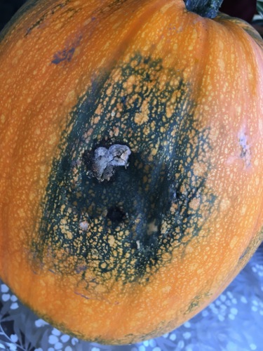 腐っている部分に穴を開けてそこから種とワタを取り出し、ちょっと早いですがパンプキンカービングの作例として活用することにしました。