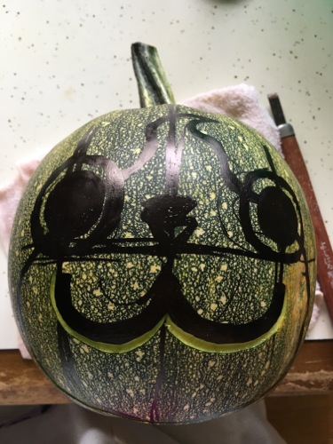 最後の大きいカボチャにはちょっと新機軸なカービングを施しました。まず全面を彫刻刀の”角”で粗めに彫ります。