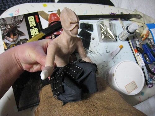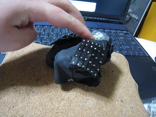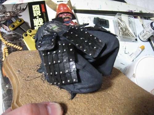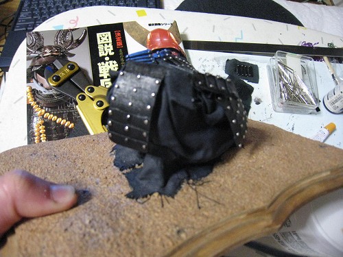 パーツを切り出して土台に接着するとこんな感じ。しかし驚いたのは、小札を貼っているうちにだんだんと自然に腿の曲面にぴったり合うようなカーブができていったことです。小さいパーツを重ね合わせる方が金属板1枚を叩き出して形を作るより人体の曲線に馴染むんですよね。昔の人の知恵ってすげぇ。