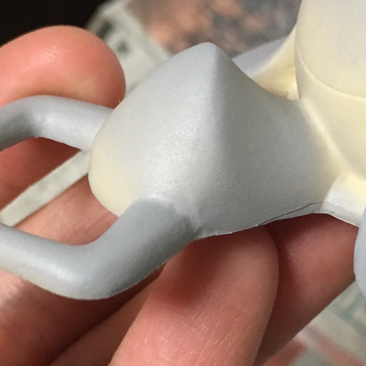 確かに気泡は驚くほどありません。ただ、やはりサフ吹きしてみると、ちょっとデコボコしたところがあることが分かりました。特に各部位の”付け根”の部分。まあワンフェス出展は当日までに複製を間に合わせなければならないのは勿論ですが、その前に「見本提出」というもっと厳しい締め切りがあるので皆時間に追われているので仕方がありません。きっとこれを作った方も大急ぎで作っていたのでしょう。