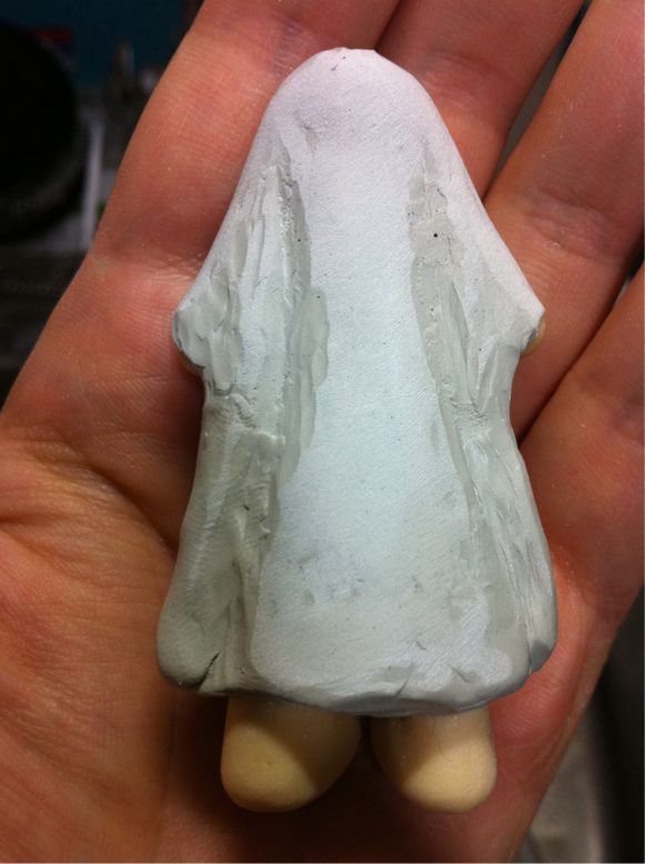 それが乾くまでまた衣装の彫刻。せっかく靴を全部削り落として素足を作ったので、実際よりちょっと裾を短めにして足を見せることにします。