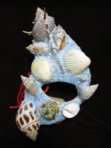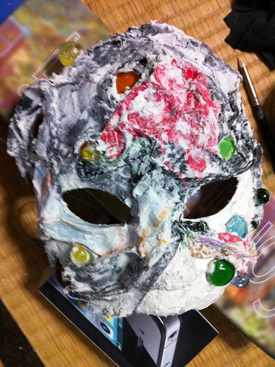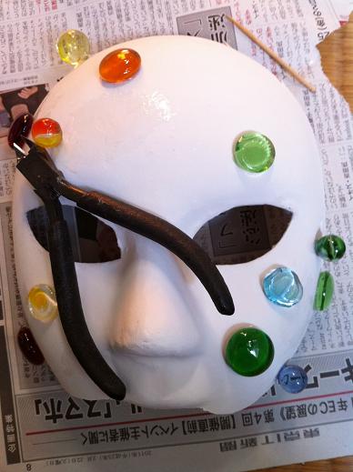 まず仮面の表面に適当にガラス玉を貼り付けます。