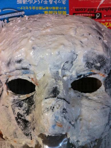 で、新たな実験として「石粉粘土ペーストと歯切れを積層して仮面のベース(素体)ができるか」を試しています。こちらも乾燥に時間がかかりますが、もし成功したら激安で仮面を作ることができるので結構期待!