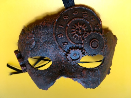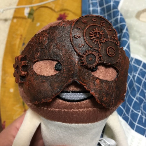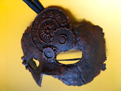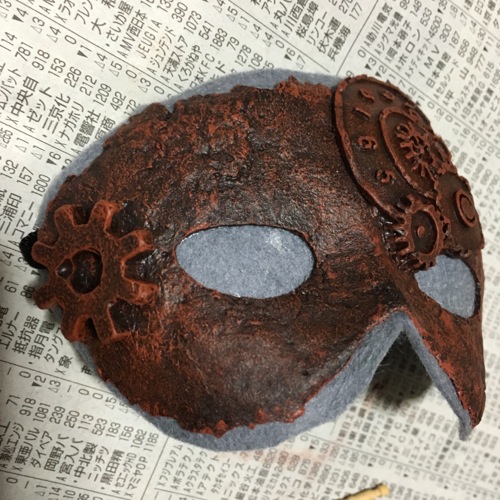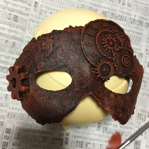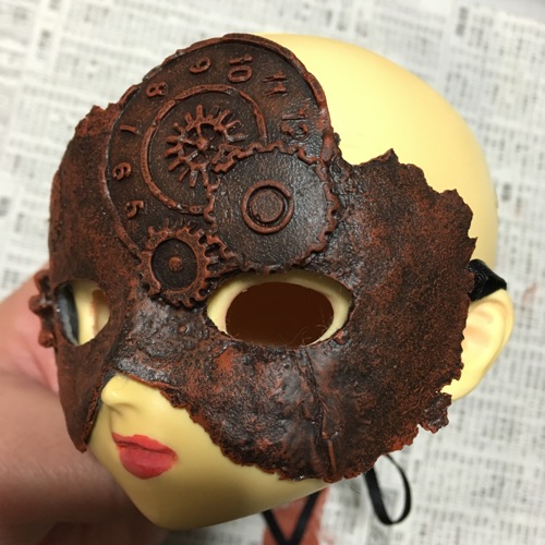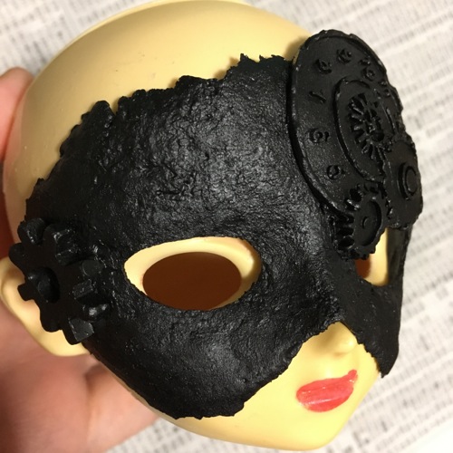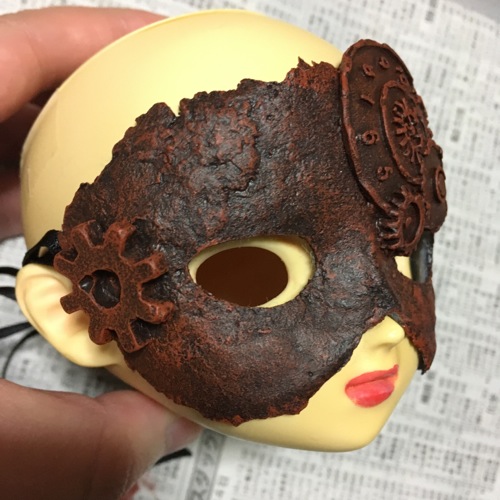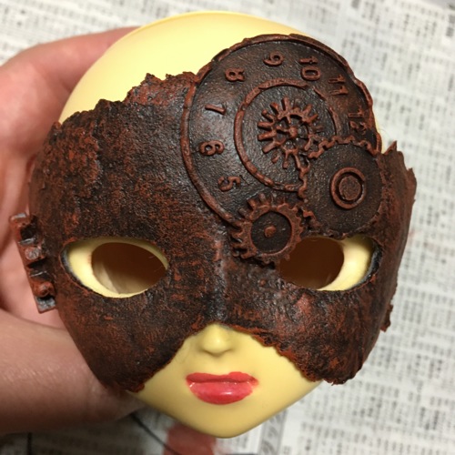 スチームパンクなドール用仮面は黒い鉄に赤錆がうっすら浮いている感じの塗装で仕上げました。アクリル絵の具をドライブラシで乗せています。