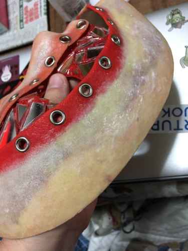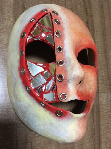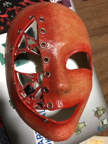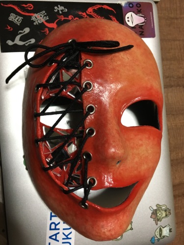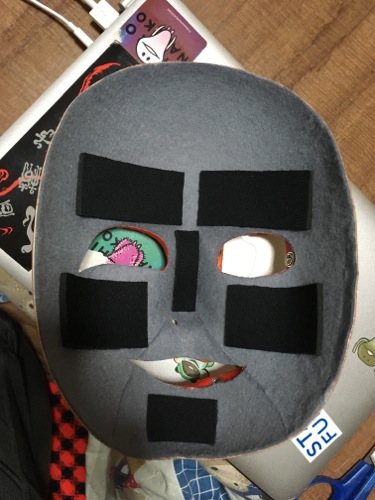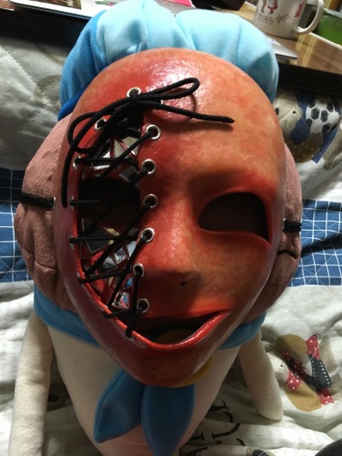 何気に大変だったのがハトメに紐を通す作業。レースアップのディティールがこの仮面の一番のウリなんですが、透明粘土が乾燥したらうっかり隙間が狭くなってしまい、紐をいちいち穴に通すのが本当に大変でした。 この後顔に固定するための紐を通す穴を開けてハトメを打ち… なめこ君のぬいぐるみで紐の長さを調節します。大きななめこのぬいぐるみは鉢周りがだいたい人間の大人の頭と同じなので本当に助かります。んふんふ! これにて完成なので、後でminneにもUPして通販を開始する予定です。ちゃんとした作品写真も改めてminneのURLと共に別エントリにてUPします。お楽しみに!