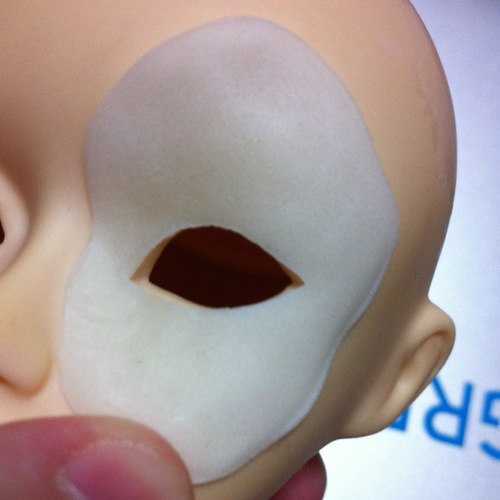 今までドール用仮面の土台に紙粘土を使用していたのですが、それだと薄く伸ばすにも強度的に限界があります。しかし、乾燥するとビニール状になる「すけるくん」なら紙粘土よりも柔軟性があり、かつ強度もあるので、こちらの方がドール用仮面の素材としては適しているような気がしてきました。薄く作った方がいろんなヘッドに合わせやすいだろうし。