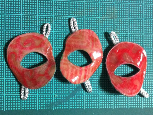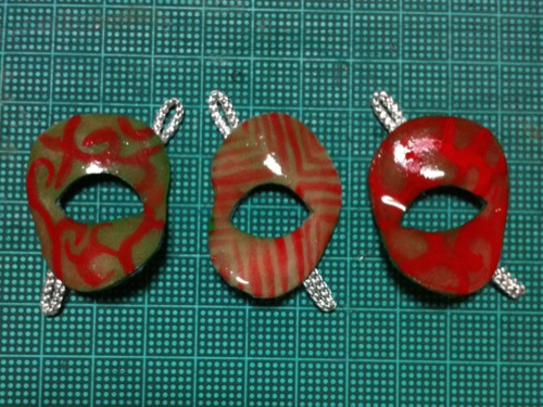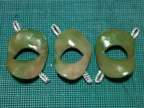 透明粘土「すけるくん」でドール用の仮面を作り、それにアクリル絵の具で塗装すると陶片のような質感になることが分かりました。なのに実物はビニールのような柔軟性があるので実に不思議な感じです。