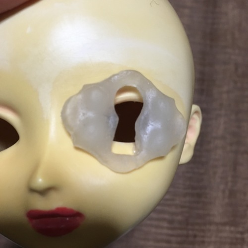 SDのヘッド(のの)に当ててみたところなんですが、眼帯として使用するにはかなりギリギリのサイズですね…。まあオビツヘッドとか男性SDのヘッドに使えば大丈夫っちゃあ大丈夫かも?