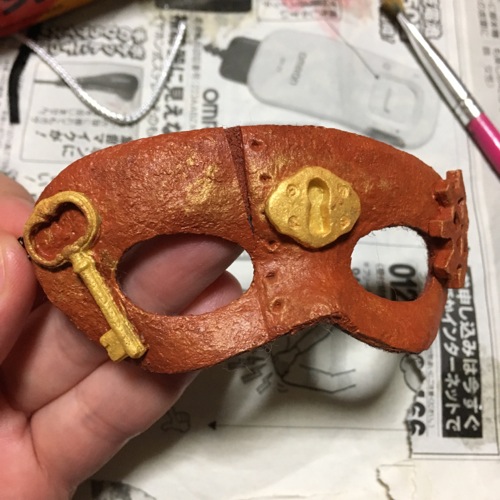 いつもは最後に裏のフェルトを貼りますが、今回はこのようなデザインなので最初に貼ってしまいます。あと別に作っていた鍵と鍵穴のパーツをエポキシ接着剤で接着します。