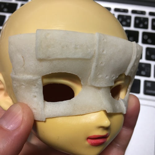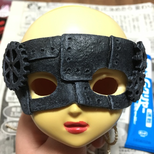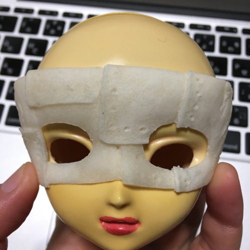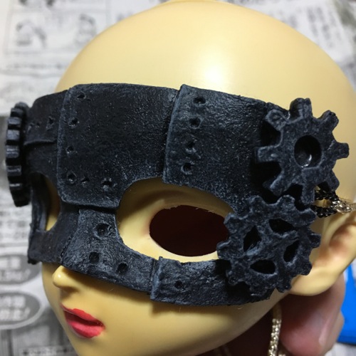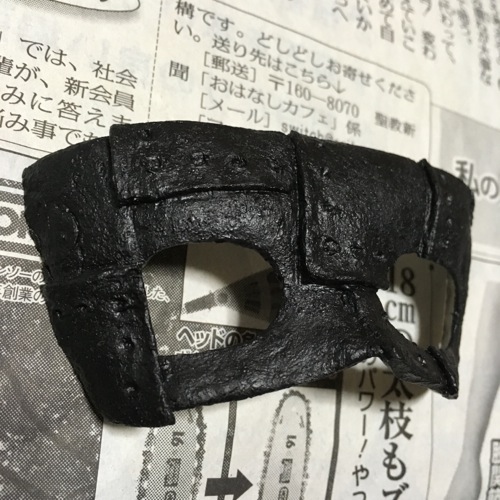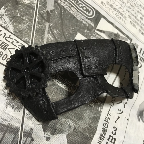 本作では仮面の土台の段階から彫刻しました。金属板を何枚も貼り重ねているように見えますがもちろん全部つながってる1つの粘土の塊です。