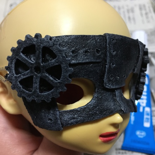 以前のシリコン型実験で複製した透明粘土「すけるくん」製の歯車パーツをエポキシ接着剤で貼ります。