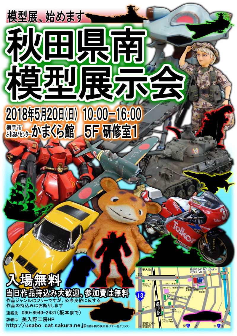 http://usabo-cat.sakura.ne.jp/kennanmokeiten.html5月20日(日)10:00~16:00、秋田県横手市の「横手市ふれあいセンターかまくら館 5F研修室1」にて「秋田県南模型展示会」が開催されます。秋田県南で模型の展示会が開催されるのはこれが初とのこと。以前もこのブログに書きましたが、秋田市では開催されているんですけどね。