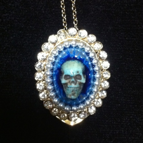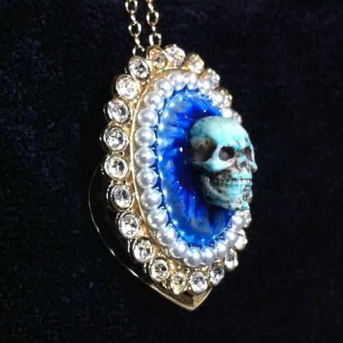 ミニskullが入った鍋のネックレス。この鍋に見覚えのある方は鋭い!実はこれ、以前100円ショップのSeriaで買ってきた鍋のオブジェです。その中にミニskullとビーズを入れて樹脂で固定しました。フタは落ちないようにエポキシパテとエポキシ接着剤でガッツリ接着しています。