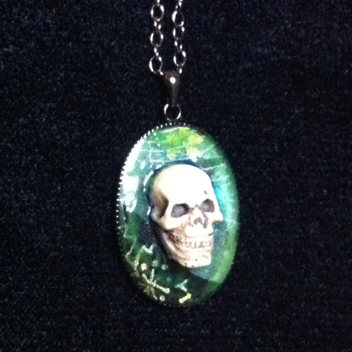 シンプルなゾンビペンダントです。頭にシルクハット型のチャームを接着してチェーンを通しています。ちょっとゾンビが大きかったかも…。これよりもう一回り小さいゾンビの頭があれば丁度良いかも。