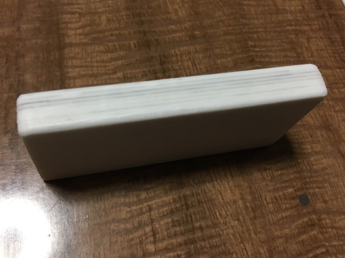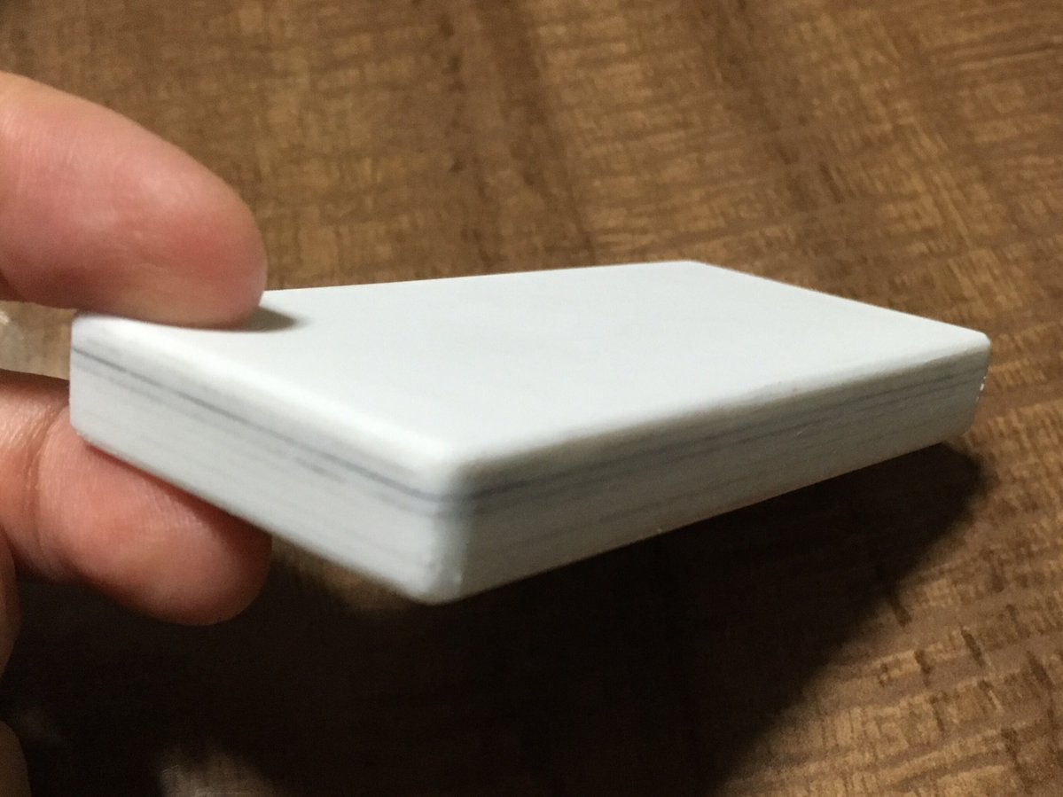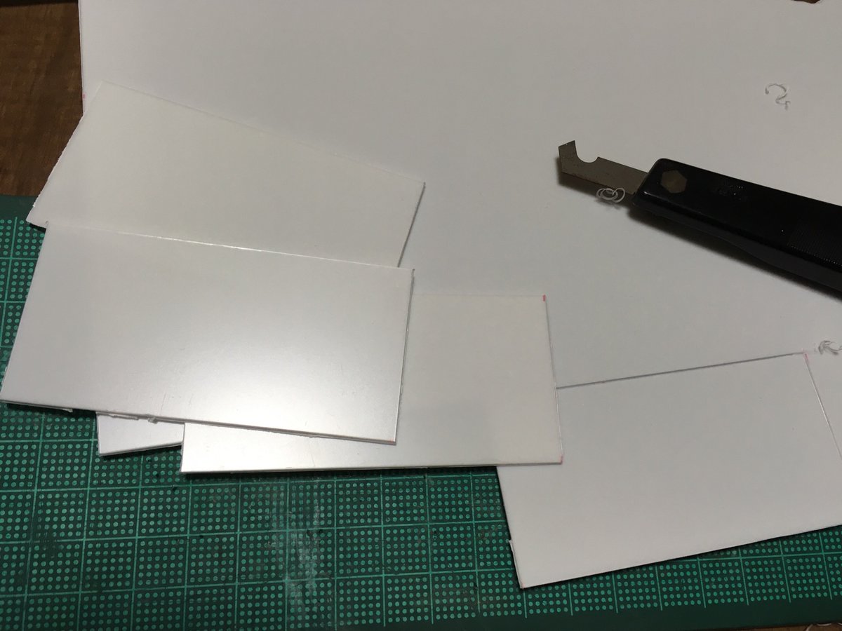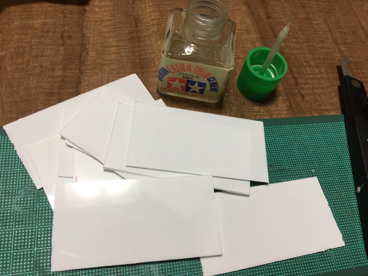 一番正確な形を作れるのは何と言ってもプラ板です。均一な厚みだから、同じサイズで何枚も切って重ねて接着すればすぐに均一な厚みのある塊が作れるから。今回は4cm×8cmで10枚切り出して重ねます。