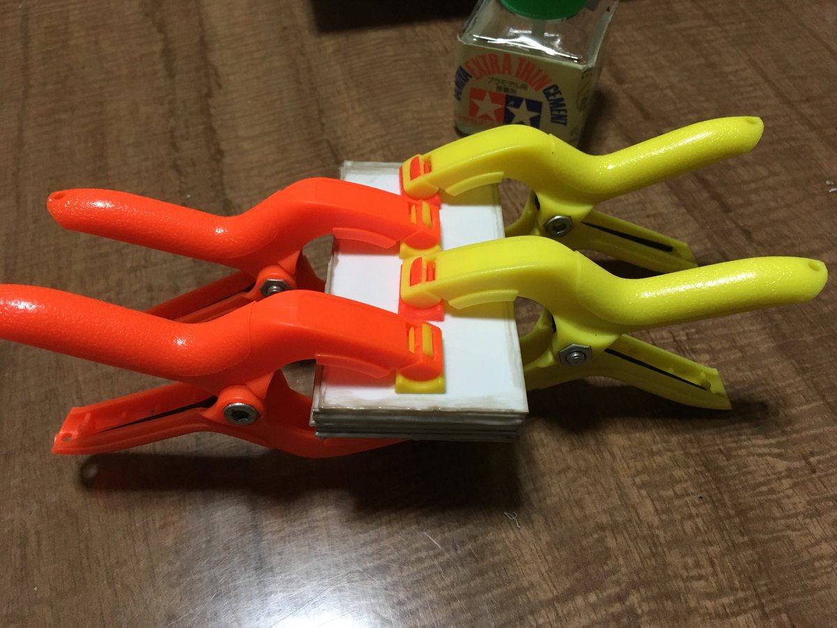 圧着する際はクランプで固定すると隙間なくくっつきます。これはダイソーで4個100円で買ったクランプ。模型用ならこれくらいのサイズで十分です。