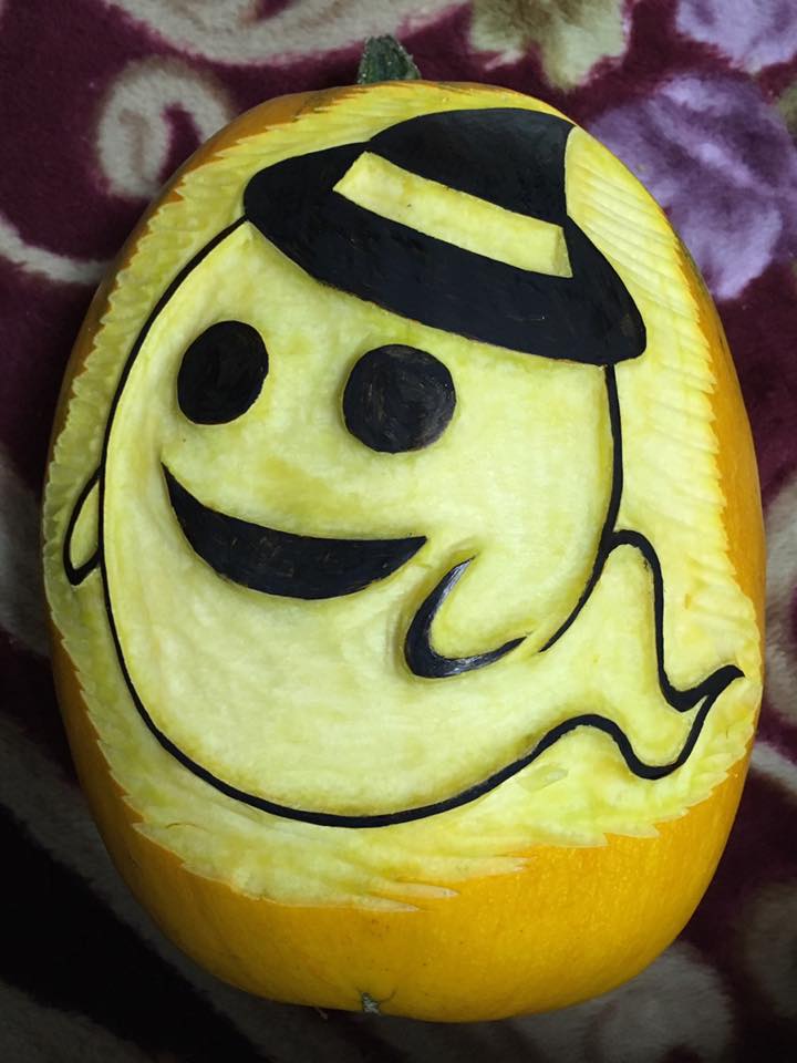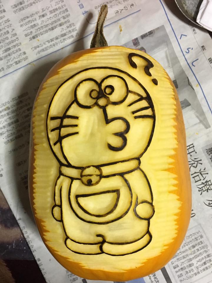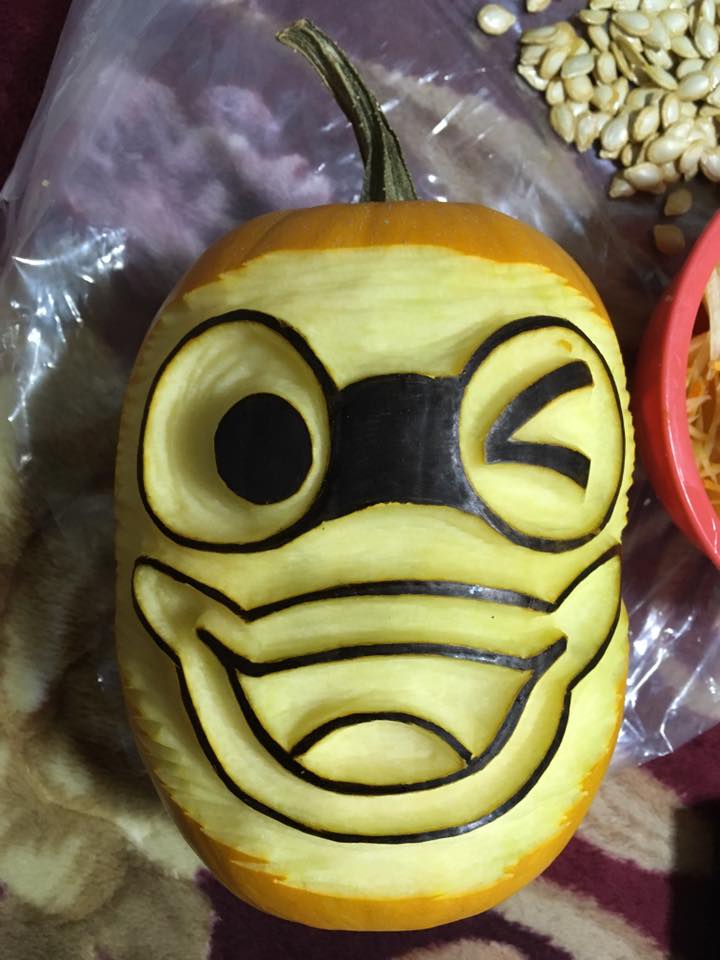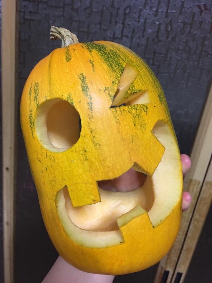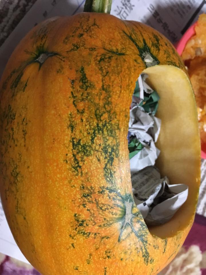 ひん曲がった形を反映して顔も曲がった感じにしてみました。凹みのところは口にして貫通。裏からワタと種をくり抜くと凹んだところだけ薄くなって強度が弱くなってしまうので、それなら穴にして貫通させた方が手っ取り早いってもんです。