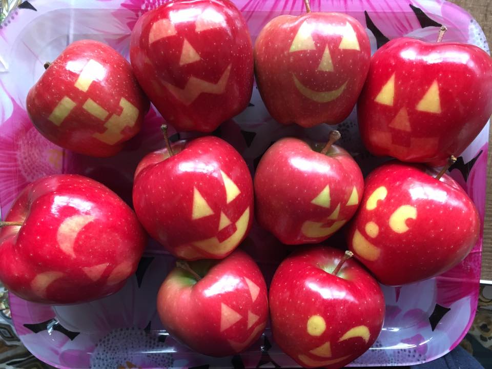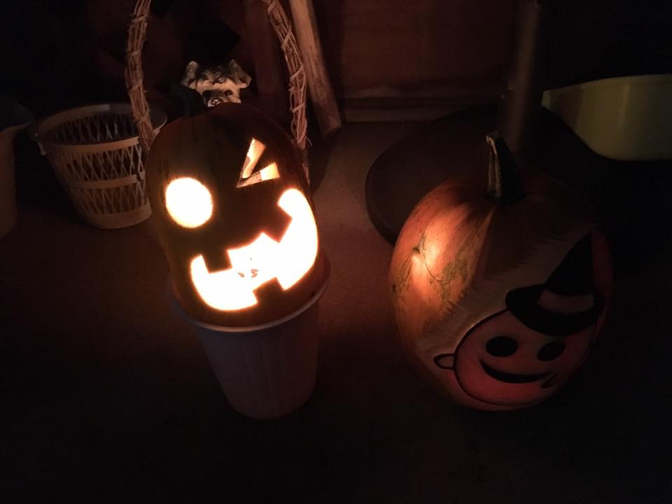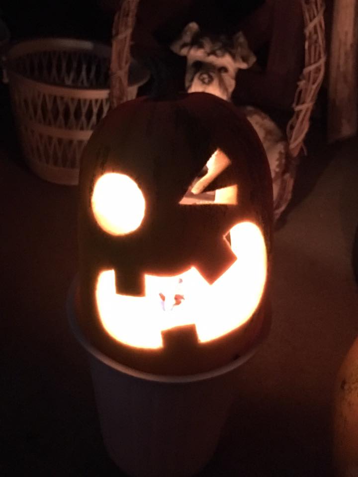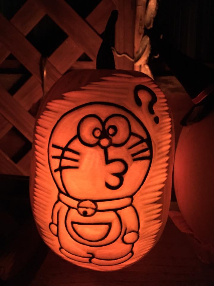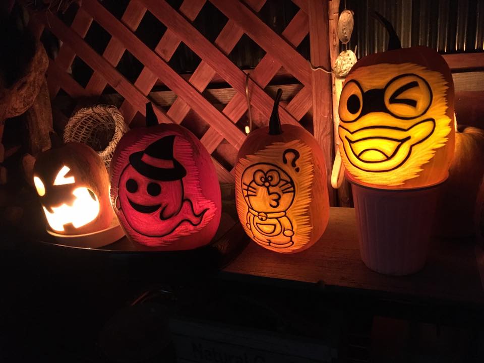 ひん曲がった形を反映して顔も曲がった感じにしてみました。凹みのところは口にして貫通。裏からワタと種をくり抜くと凹んだところだけ薄くなって強度が弱くなってしまうので、それなら穴にして貫通させた方が手っ取り早いってもんです。
