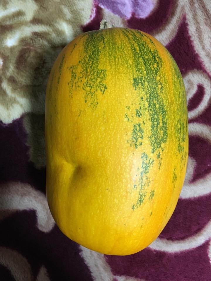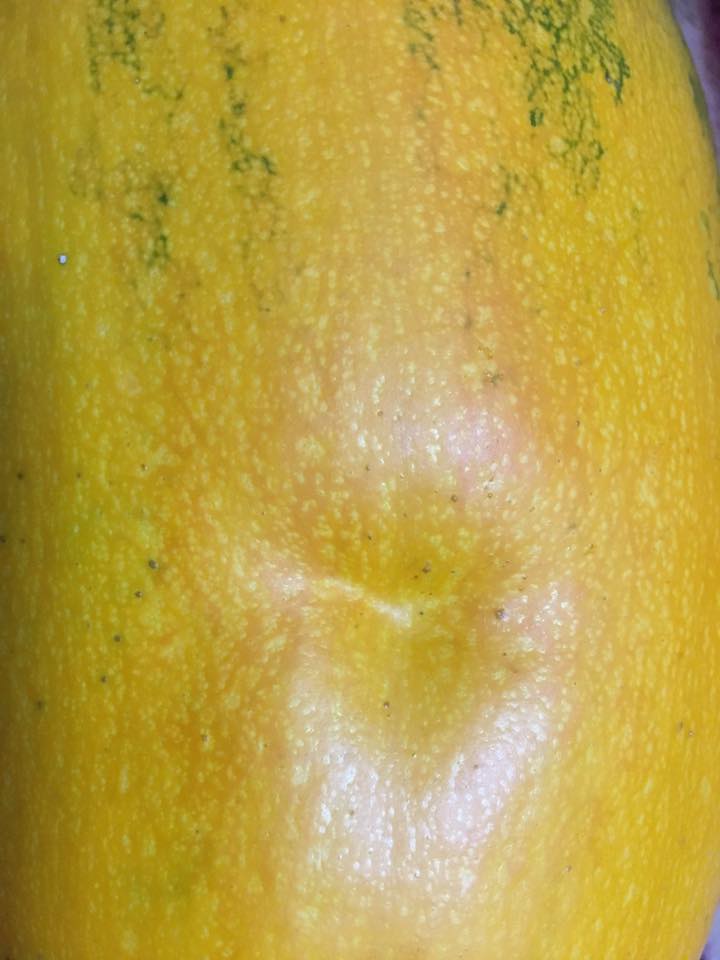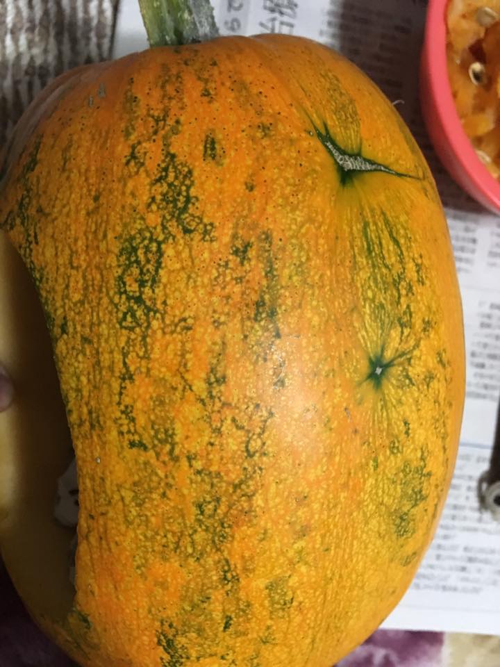 これ、別に石ころだらけのところとか入り組んだところとかに生えていたわけではありません。他のカボチャと同様普通に畑の土の上に生えたのに、なぜかこれだけ謎の凹みができたうえにひん曲がってしまったのです。おそらく曲がってしまったのもこの凹みが原因なのでしょうが、不思議なことに、この凹みの部分には本当に何の障害物もなかったのです。
