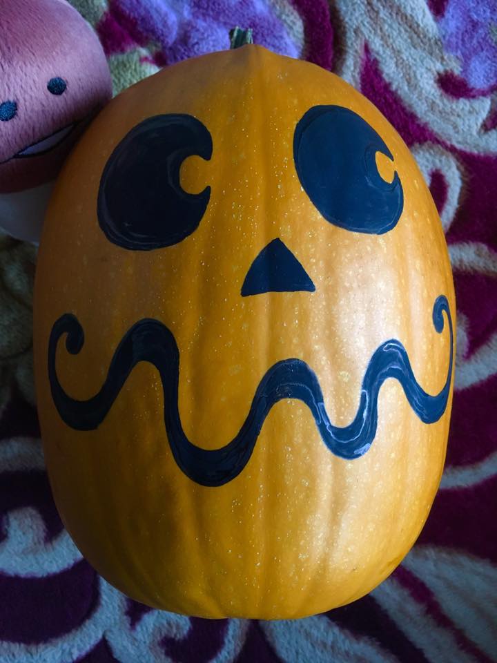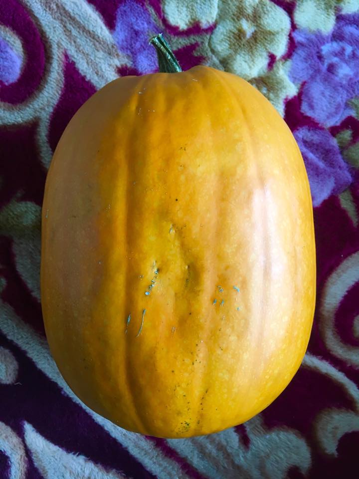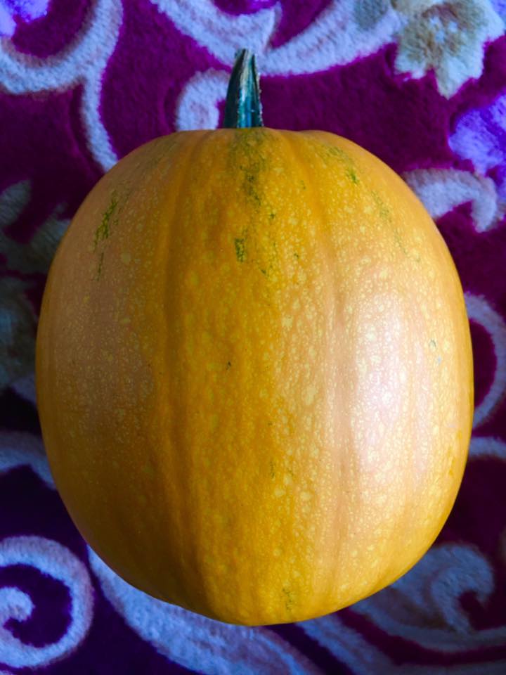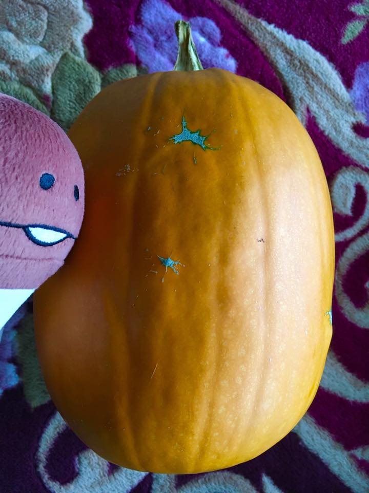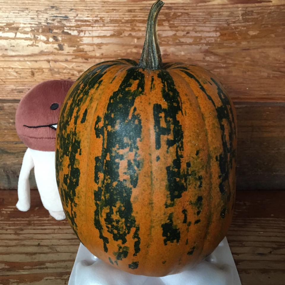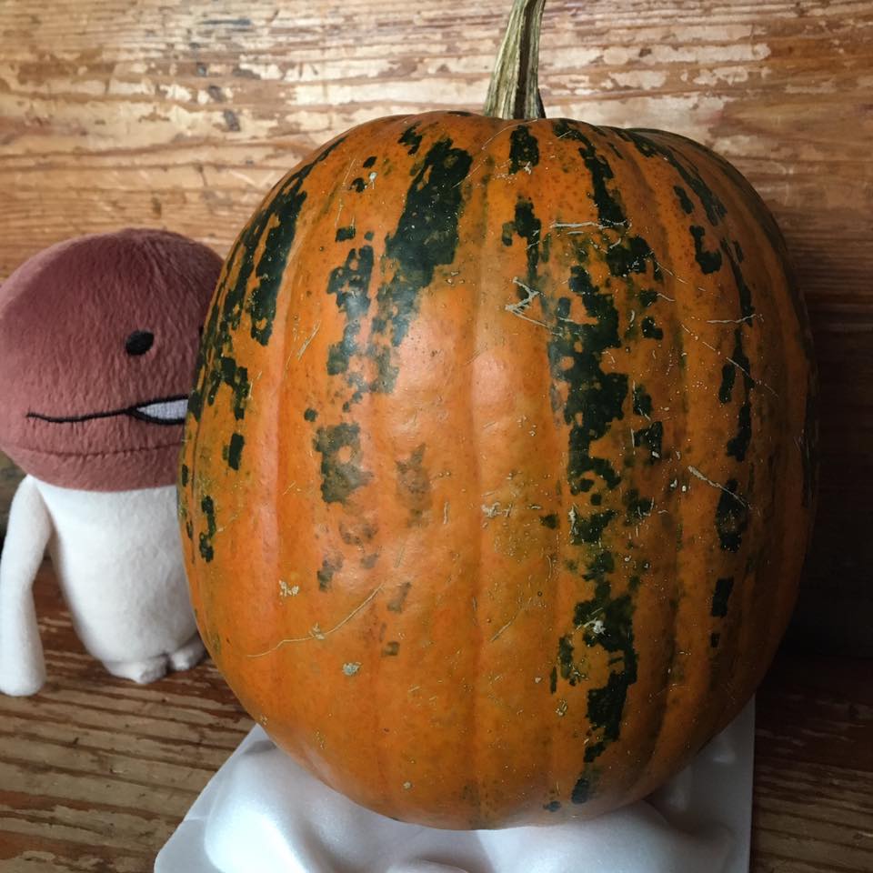 これもまさにそうで、ツルンとしておらずボコボコと段差がはっきりした表面、オレンジみの強い色、なかなか消えない緑色の筋と、本来のハロウィンパンプキンの特徴が表れています。ただちょっとひっかいたような傷が付いてしまったのが残念ではありますが…
