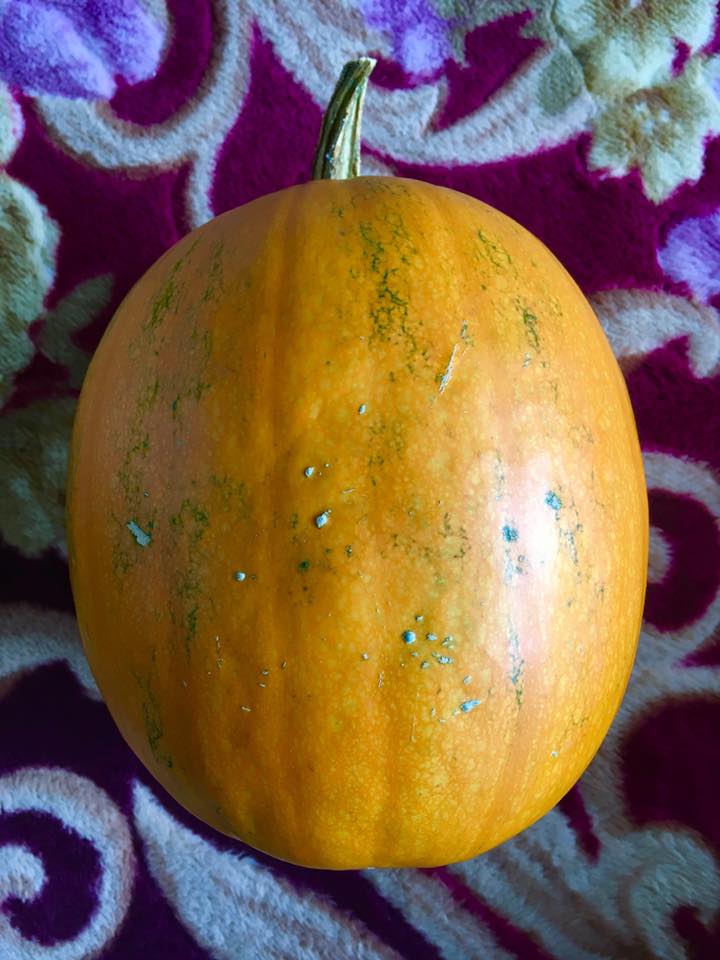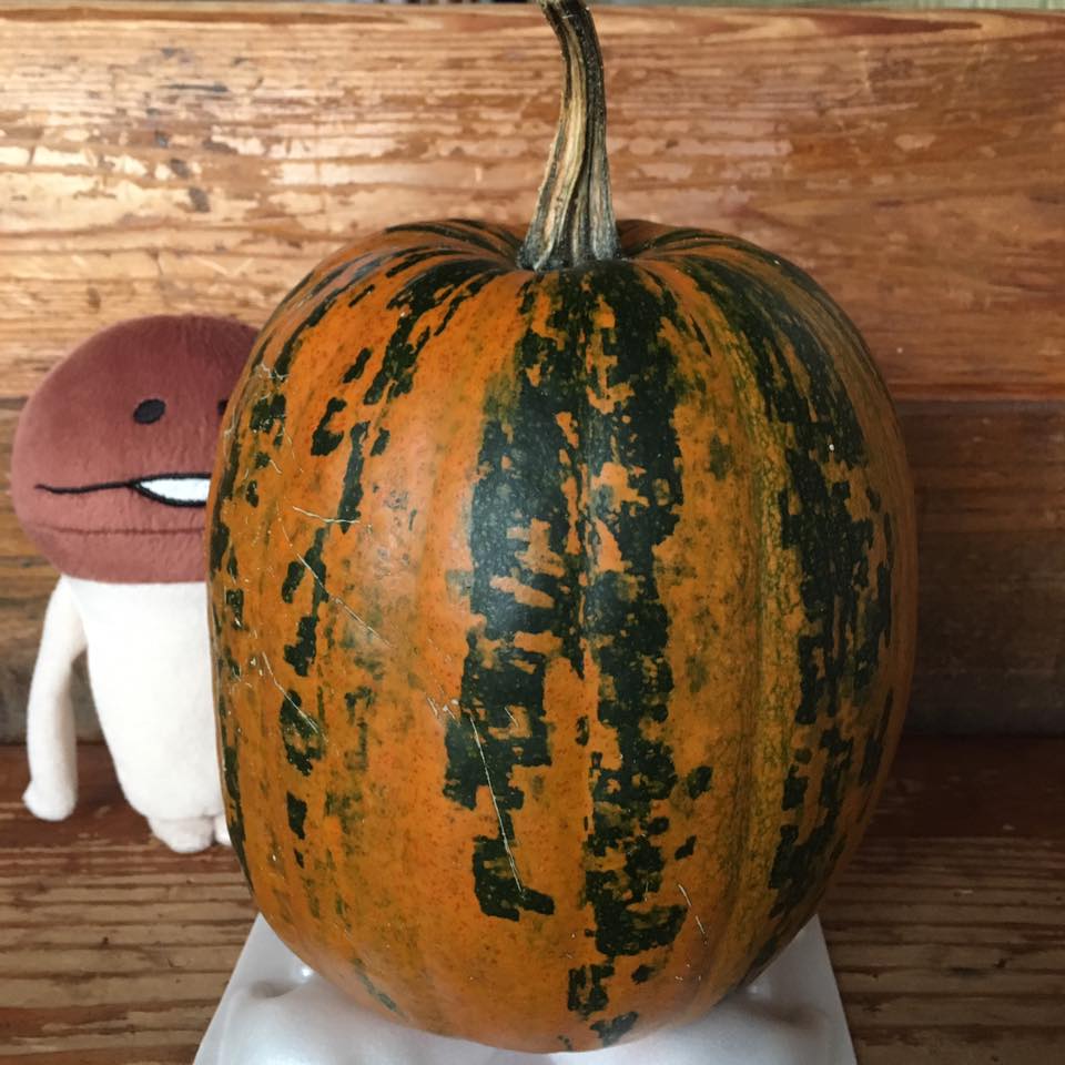 ハロウィンパンプキンを栽培していると、毎年必ず1個”先祖返り”した実が生ります。カボチャは他の農作物と交雑しやすい植物で、厳密に管理しないとすぐに周辺で栽培されている他の野菜や果物の花粉が雌花に付着してそのDNA情報を取り込んでしまい、妙ちくりんな形の実になってしまいます。まあその性質のおかげで多種多様な品種が生まれたのでしょうが。ところが、どんなに交雑を重ねた種でも、こんな感じに元々のカボチャの姿のまま生る実が出てきます。