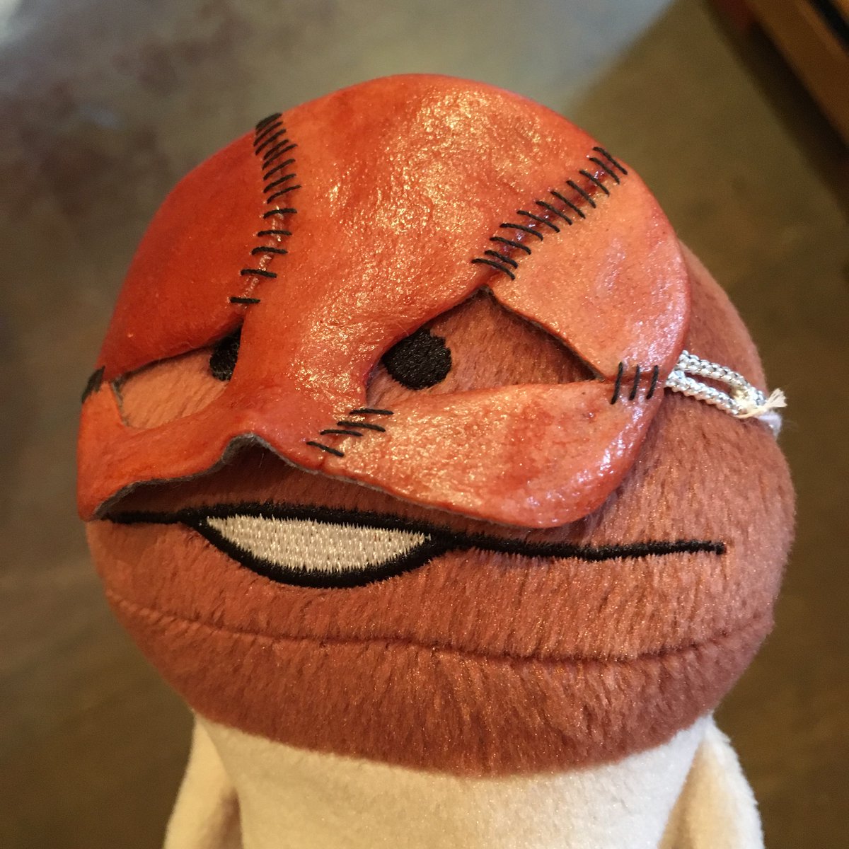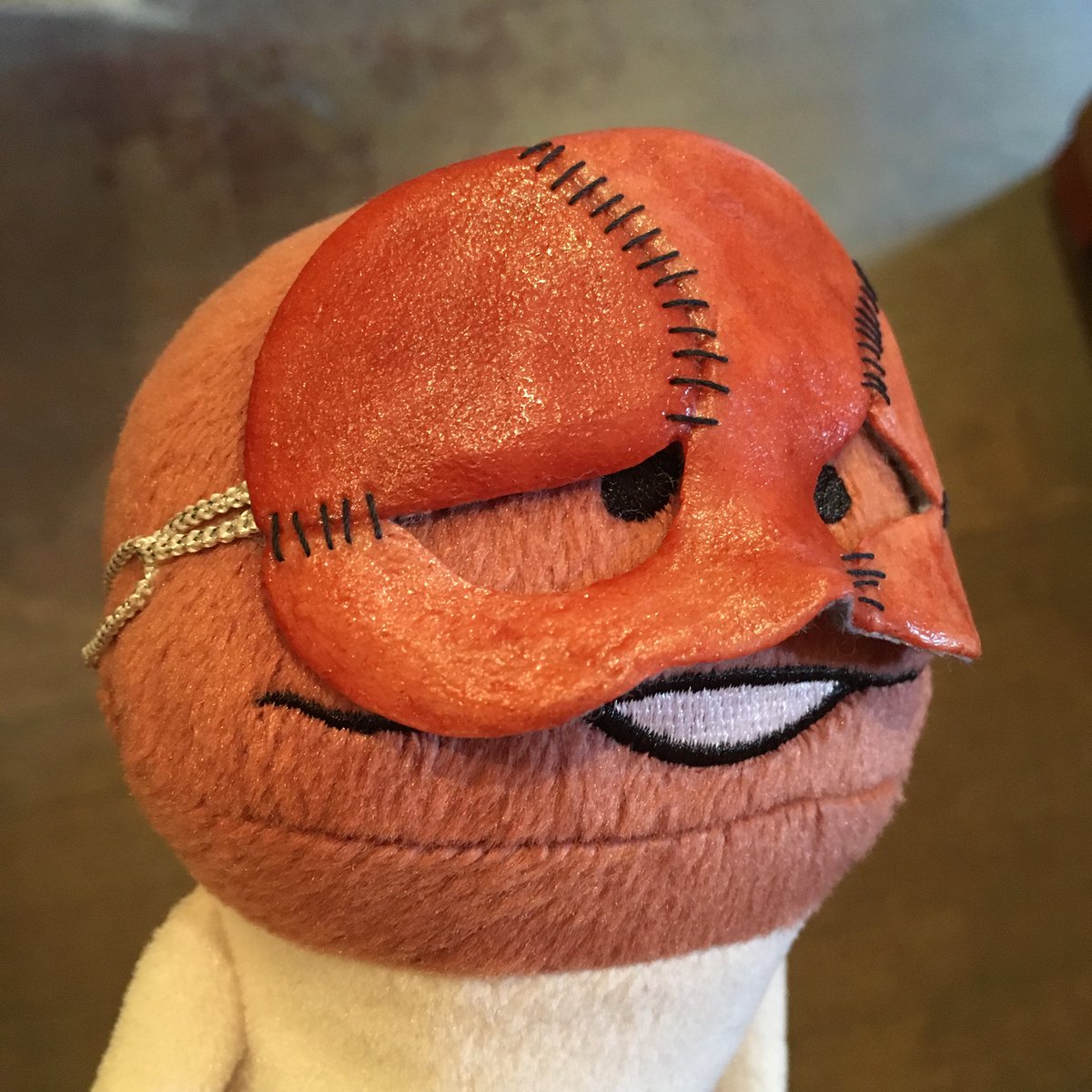 今回はハロウィンっぽいツギハギの仮面を納品しました。革っぽい質感ですが樹脂粘土製でちょっと透明感があります。柔軟性もあり、曲げにも強いです。私はスーパードルフィーのヘッド「のの」に合わせて作りましたが、見ての通りレアなめこぬいぐるみの普通なめこ(通称:インスタなめこ)にもピッタリ。あと雪ん子なめこやアニメ版の「なめこ君」にも合います。まあ普通なめこと同じくらいの鉢周りで目の位置さえ合えばだいたい着けることができるでしょう。