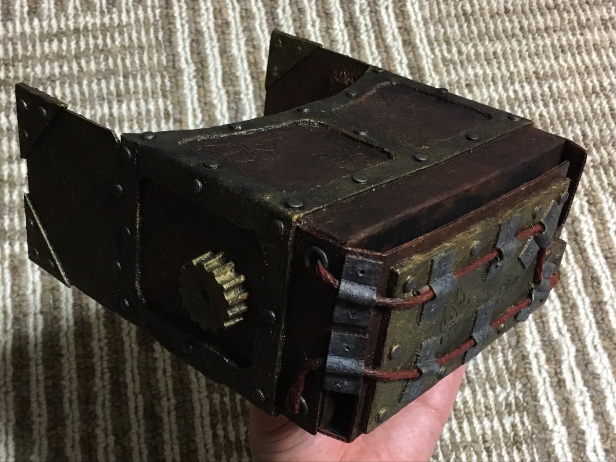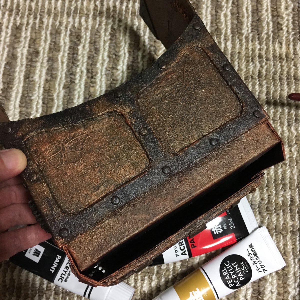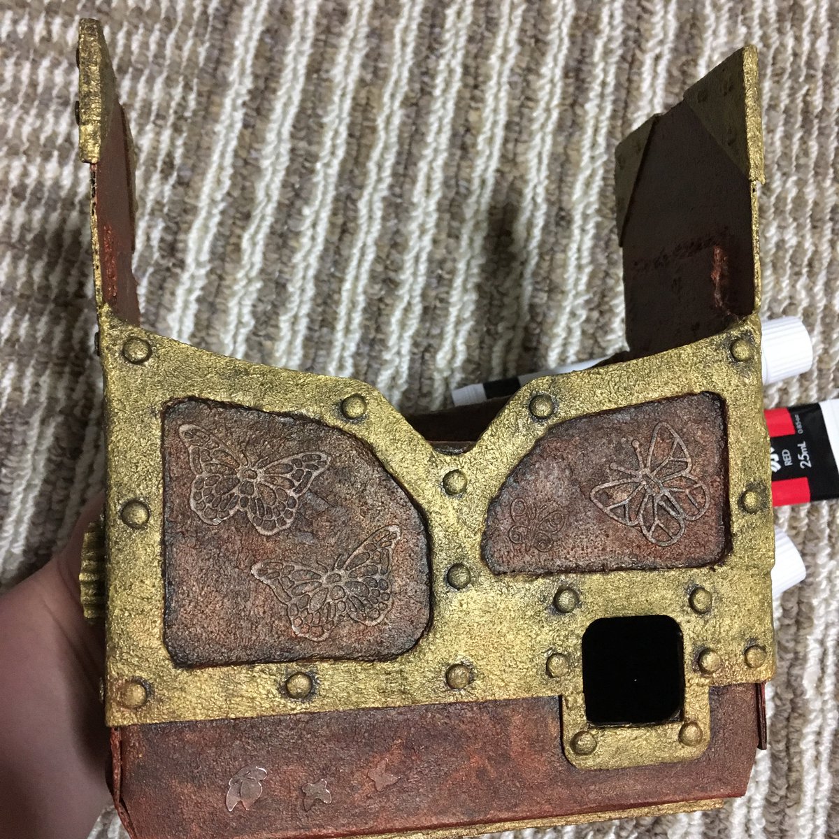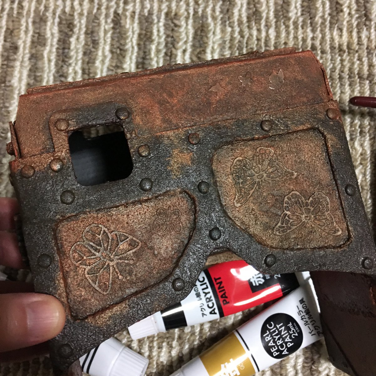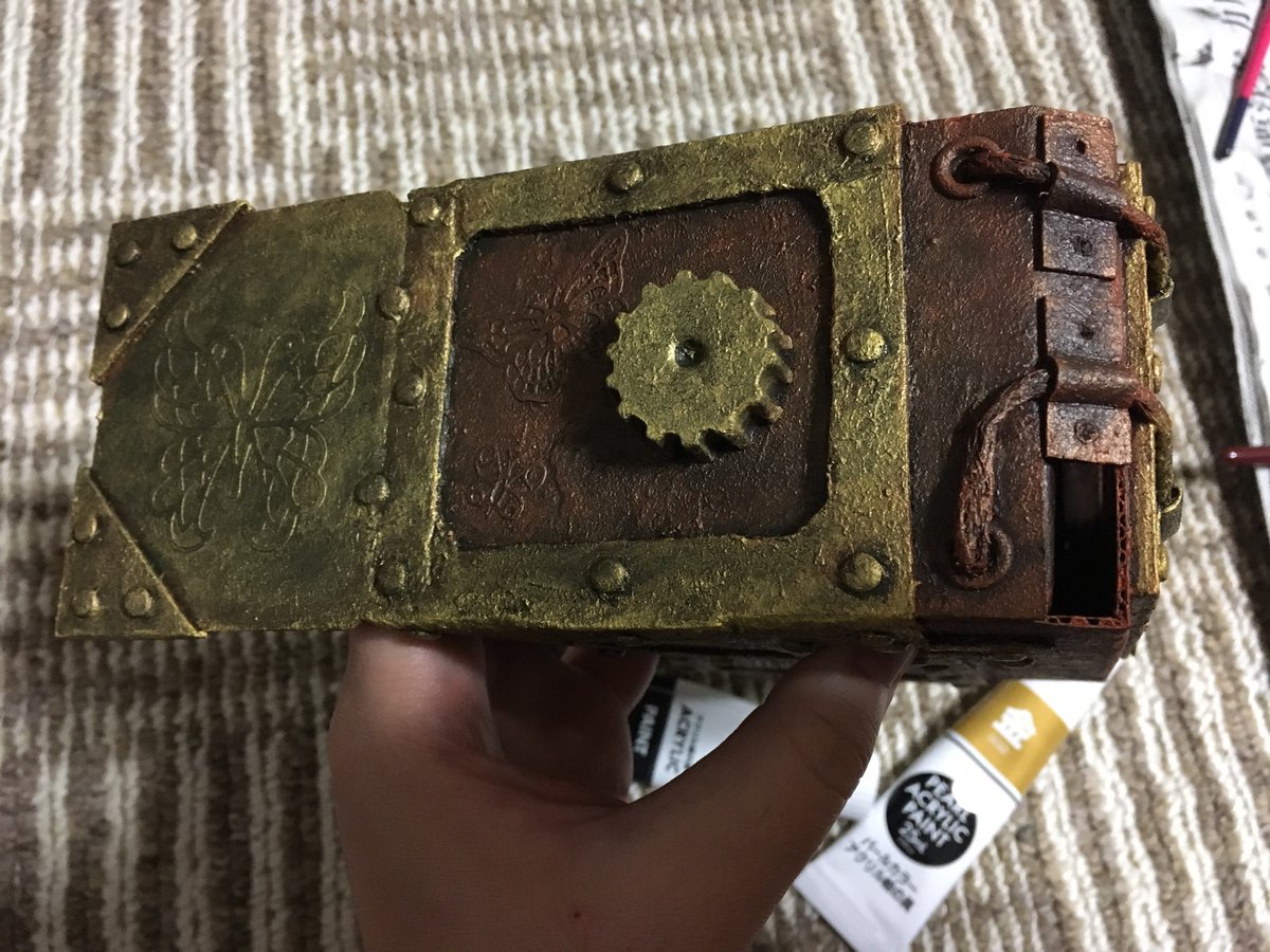 とりあえず余った色を適当に混ぜて全体に塗ってみました。塗装はダイソーで買ったアクリル絵の具です。アクリル絵の具はすぐ乾くので作業効率が上がります。ここまできたらそろそろ「スチームパンク」って言ってもいいでしょう。