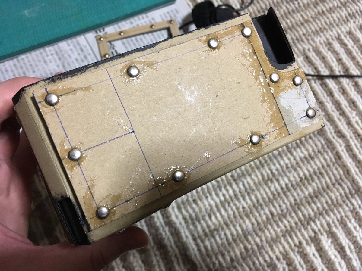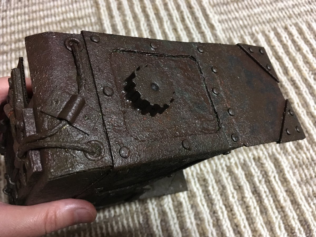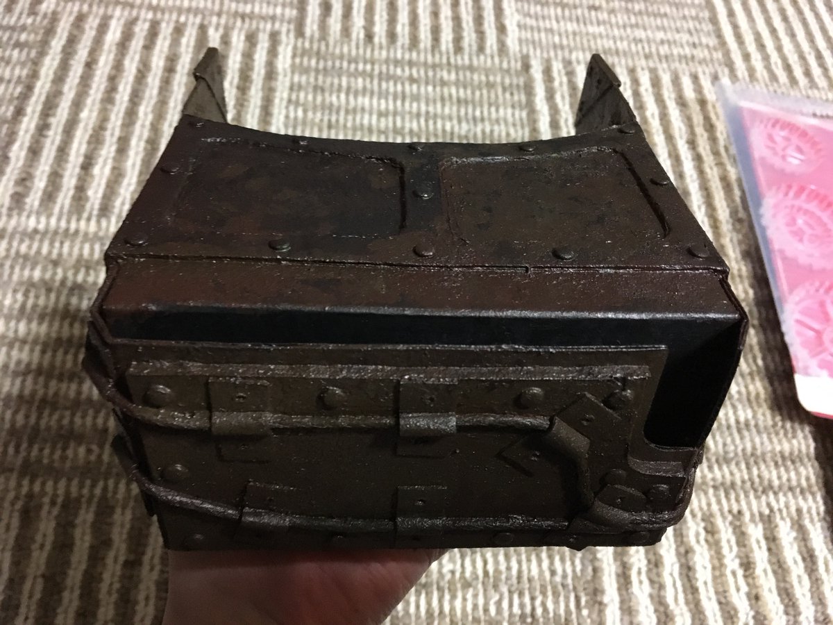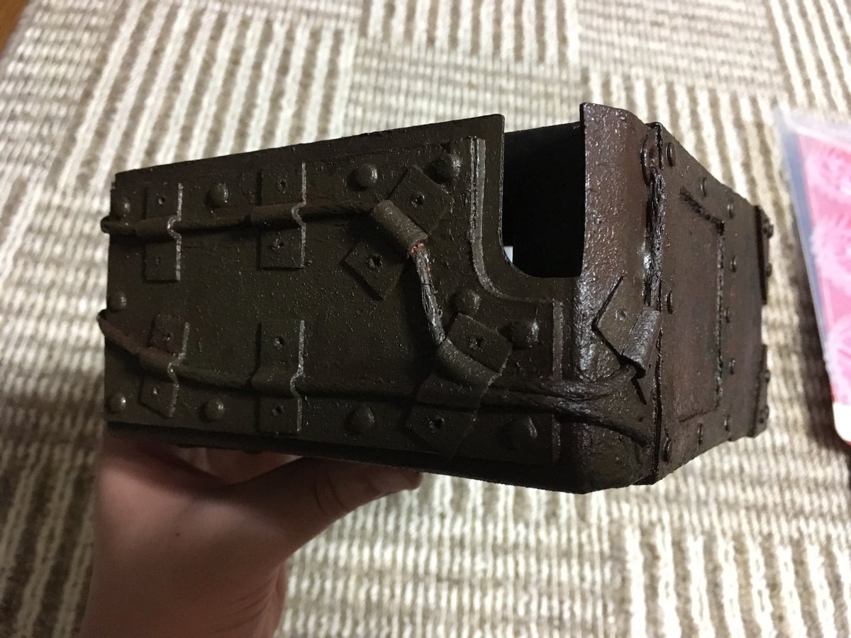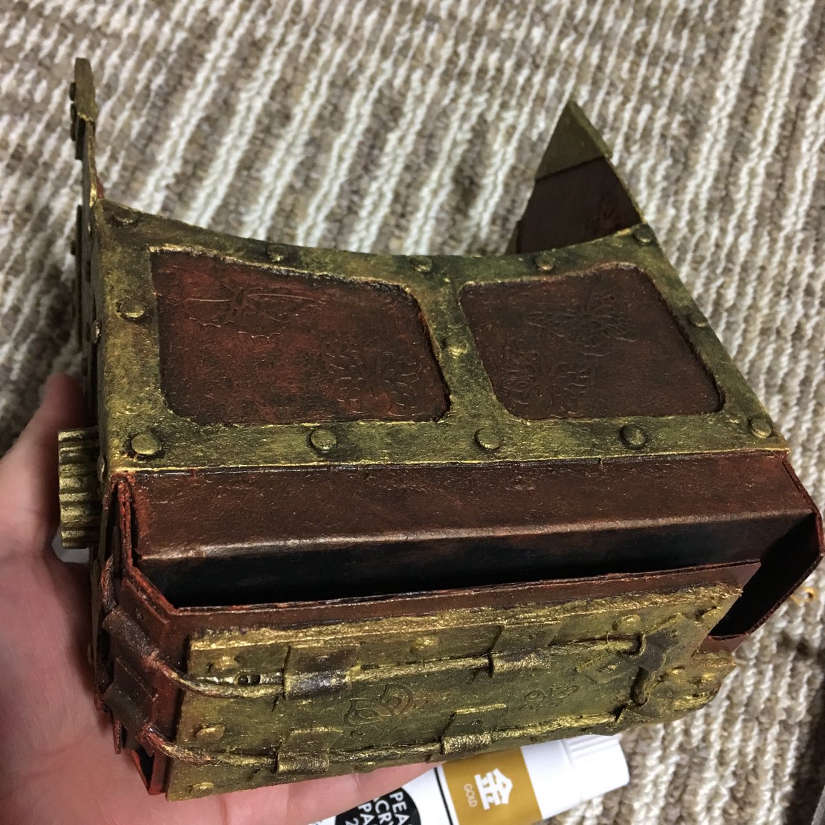 とりあえず余った色を適当に混ぜて全体に塗ってみました。塗装はダイソーで買ったアクリル絵の具です。アクリル絵の具はすぐ乾くので作業効率が上がります。ここまできたらそろそろ「スチームパンク」って言ってもいいでしょう。