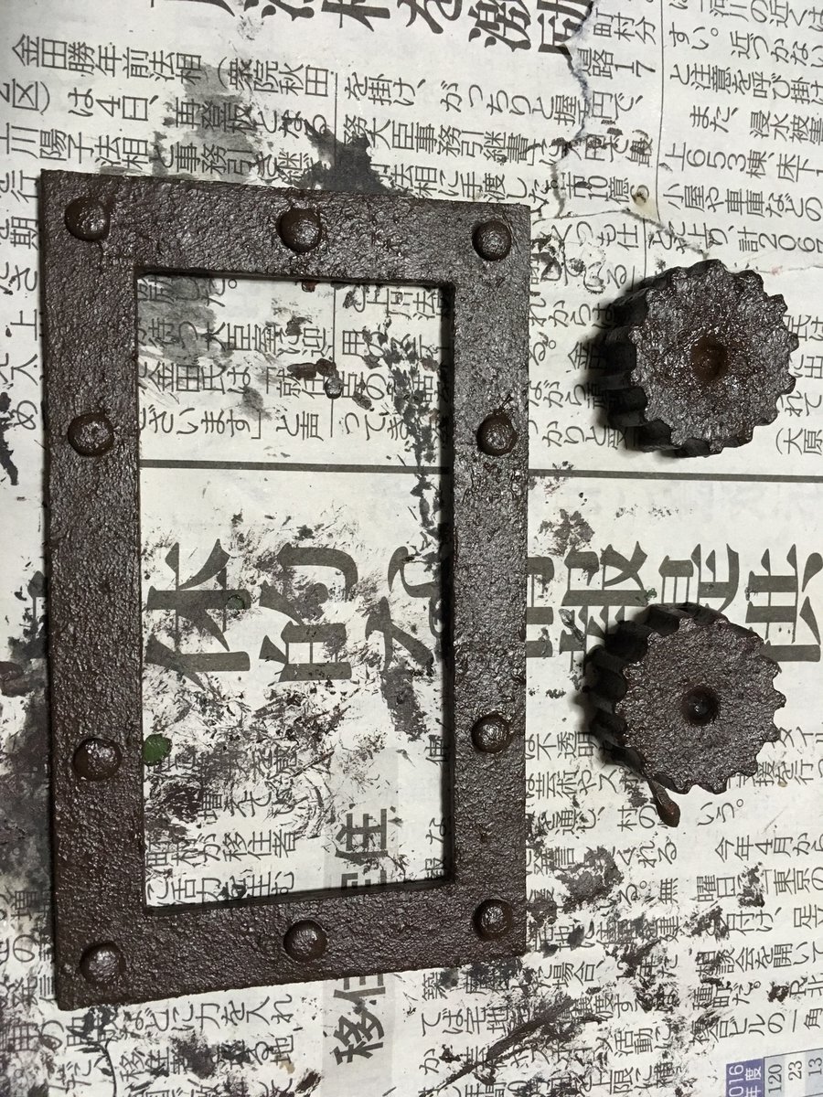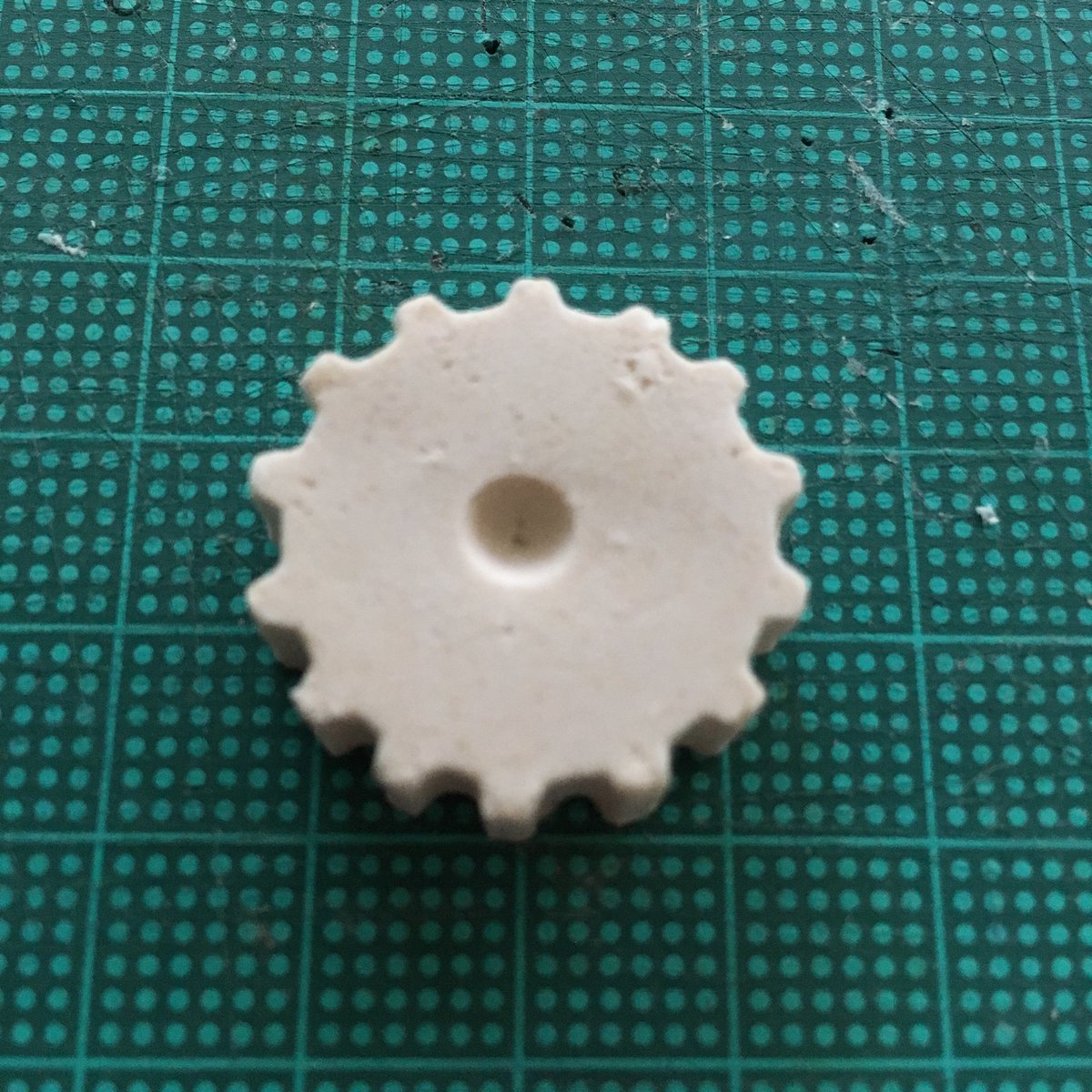 で、この歯車の型から小さくて厚みのあるものを木粉ねんどで2個型取ります。粘土なので作業できるまで乾燥にちょっと時間がかかるのですが、その間にまた別の作業をします。