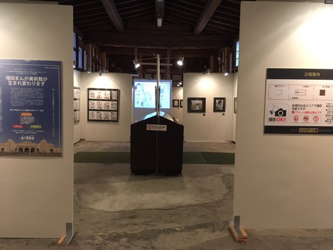 まんが美術館」があります。それが市長の提案により”世界有数の「漫画の聖地」”とするため今年から2年をかけて大規模リノベーションされることになりました。それにしても、1995年に当時のバブル景気の残りカスを引きずって建設されたハコモノとは言え、それなりに町の観光資源となっていた施設が2年間も使えなくなるのは大打撃です。そこで、休館中は町内にある施設を代わりに使用し”移動特別企画展”が開催されることになりました。その第一弾がこの『蔵とマンガ 異文化交流 序章「マンガアート展」』です。会場は商店街(