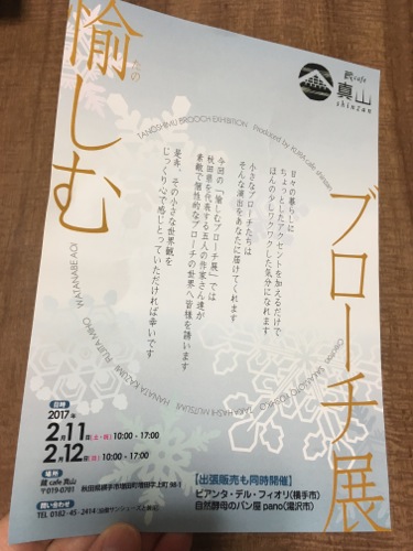 増田町の商店街には蔵カフェがいくつかあるのですが、そのうちの一つ「蔵cafe 真山」にて秋田県のジュエリーアーティストのブローチ作品を集めた展示即売イベント「ブローチ展」が開催されます。ハンドメイドが好きな人はこっちに行っても楽しめるんじゃないでしょうか。詳細は