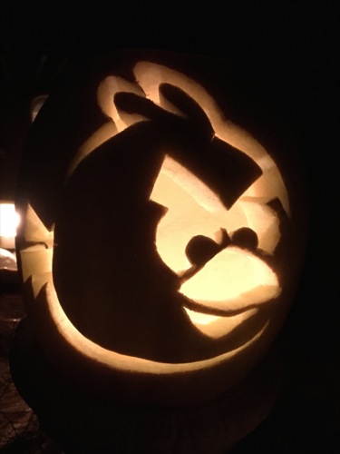 昨日のマリオで「線彫り」のコツがなんとなくつかめたので、同じ要領でアングリーバードのレッドを彫ってみました。見ての通りまんまるフォルムのゲーム版デザインです。ちょっと大きく彫ってしまったのでカボチャの曲面のせいで端っこがちょっと歪んでしまいました。モチーフを大きく描くのも考えものですね。