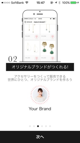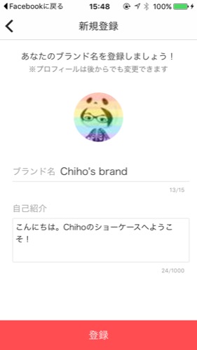 アプリを一番最初に起動した際にプロフィール情報とブランド名、自己紹介を入力します。私はFacebookアカウントでログインしていまのところほぼそのままです。もちろんこれらの情報は後から編集できるので、ちゃんとしたブランド名にしたり、プロフィール画像を自分のブランドロゴに変更するとよいでしょう。