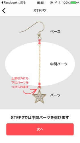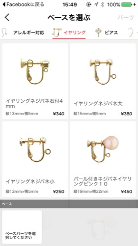今のところ作れるアイテムは、ネックレス、ピアス、イヤリング、イヤーフック、ブレスレットで色はゴールドのみ。ピアスはアレルギー対応の金具も用意されています。最初に作りたいアイテムのベースとなるパーツを選択します。