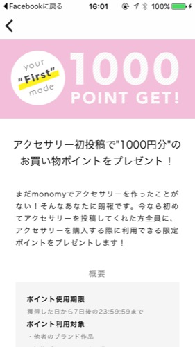 なお、現在アクセサリーの初投稿で1000円分のお買い物ポイントがもらえるキャンペーンが行われています。